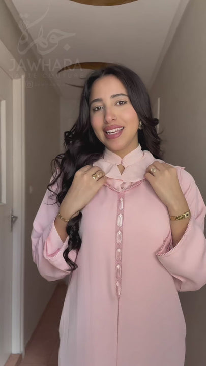 جلابة مغربية أنيقة مصنوعة من قماش كريب كوريا عالي الجودة بلون الوردي البودري الناعم الذي يمنح إطلالة أنثوية راقية ومميزة.
