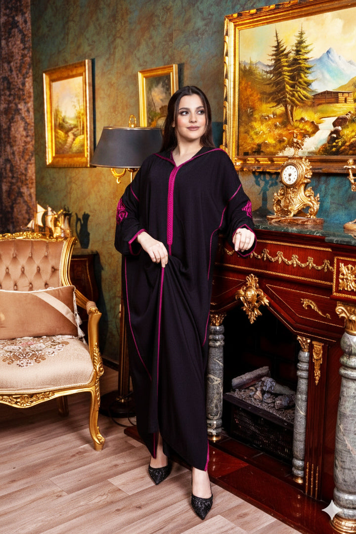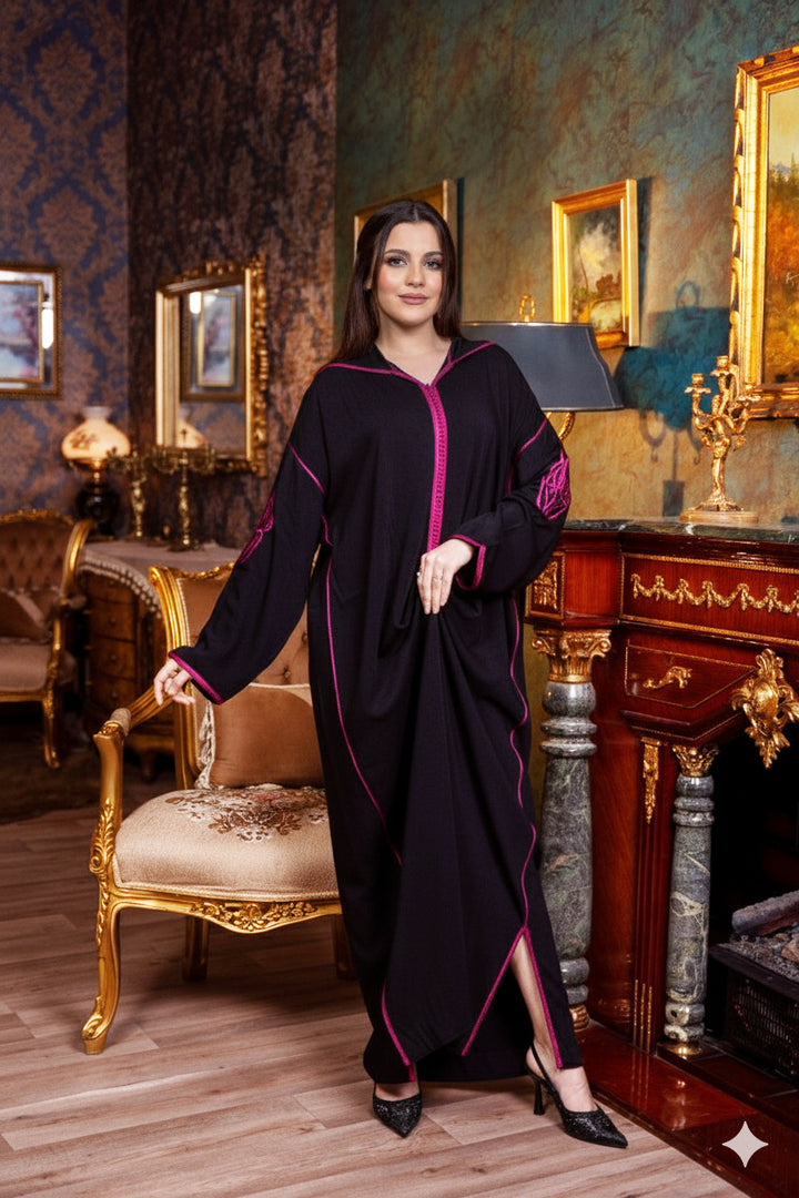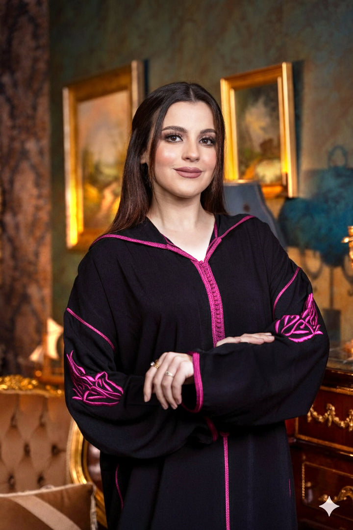 جلابة من قماش المليفة باللون الأسود، مطرزة بتطريز "طرزة" باللون الوردي الفوشيا.